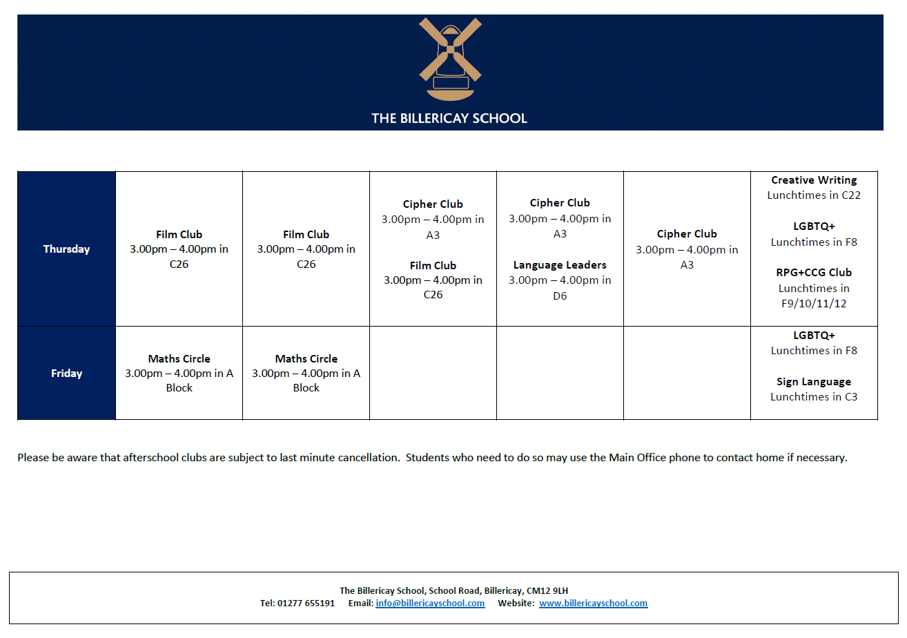 Please find below details of the Extra Curricular Clubs available for 2025/26